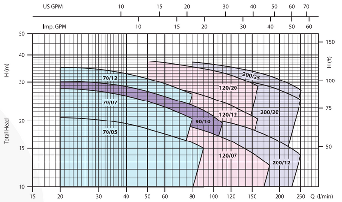 | Model | Flow Maks. (mΒ³/jam) | Head Maks. (m) | Power (kW) | Discharge |